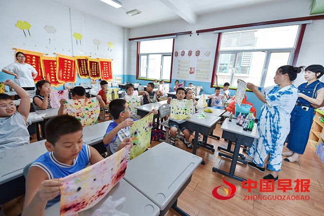课堂上,孩子们亲手体验扎染技艺,感受非遗独特魅力,度过一个有意义的假期。